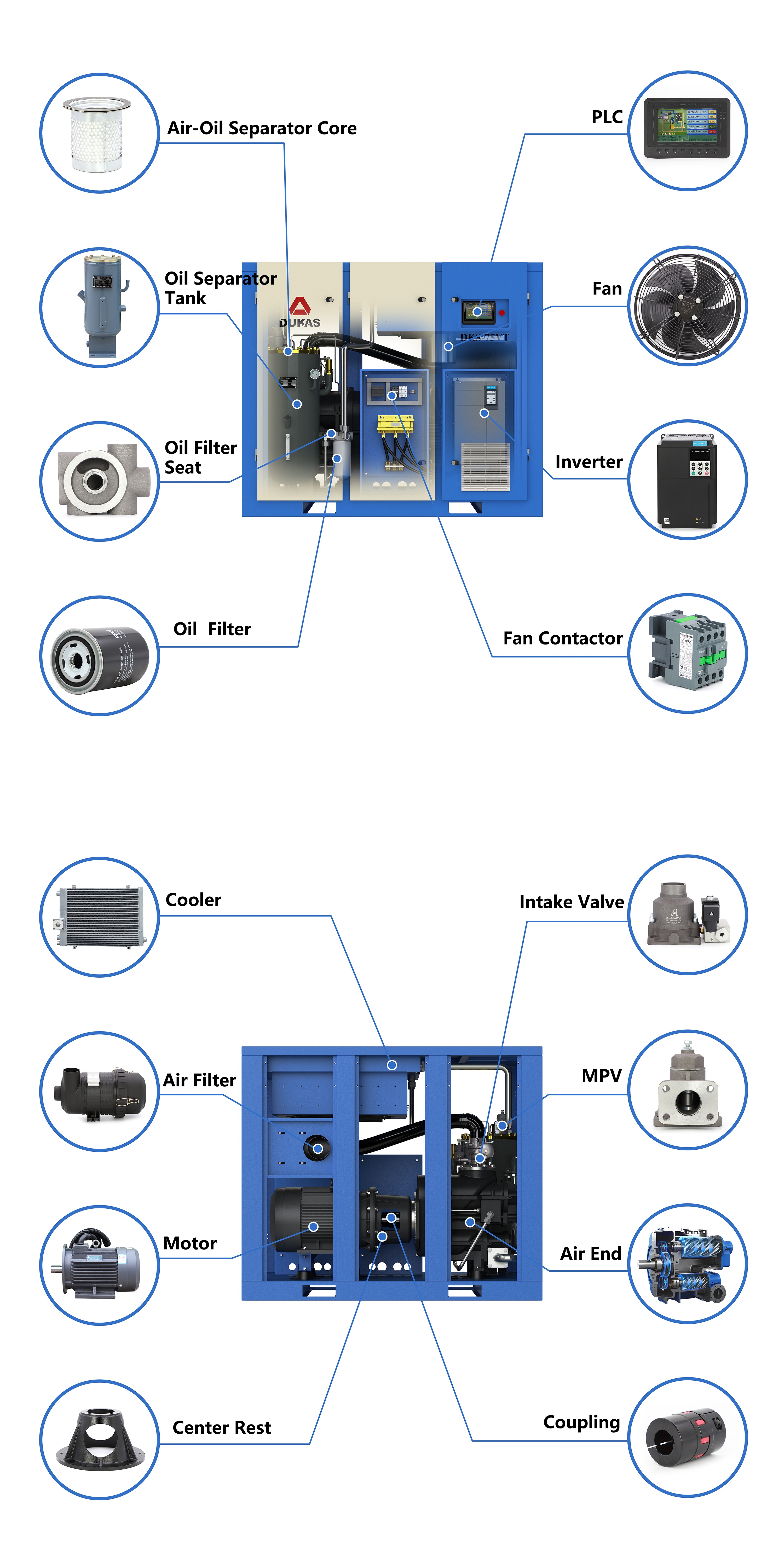 - Two-stage PM VSD air compressor mainframe is more efficient and more energy-saving. It can save up to 40% energy compared with ordinary industrial frequency machines. Calculated at 8000h/unit/year, it can save electricity costs 30,000 USD per year.