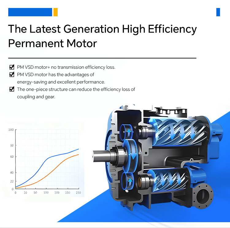 Equipped with a permanent magnet synchronous motor and variable frequency control, the speed is precisely adjusted according to air consumption, with no-load losses approaching zero, achieving overall energy savings of over 30%.
