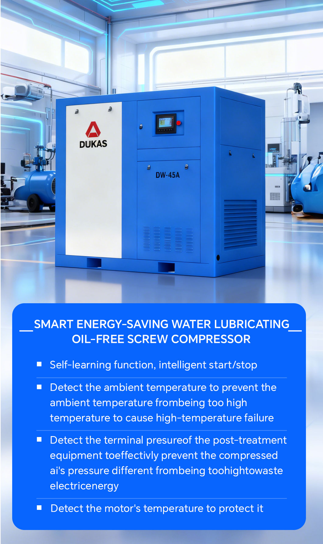 The entire unit employs multiple noise reduction designs, achieving an operating noise level as low as 62 decibels, meeting the environmental standards required by modern factories. Suitable for noise-sensitive environments such as laboratories, hospitals, and precision assembly workshops.